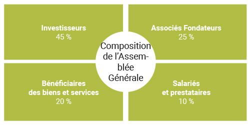 Les différents collèges (porteurs, partenaires, salariés…) sont représentés selon des règles statutaires, dans le respect du modèle SCIC.